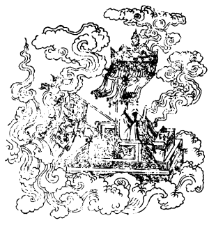 帝金冠,绛服,青缘,红旗,五色云,外取宜装。